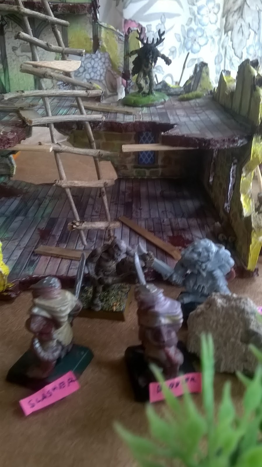 Grinder shoots at Slasher, 5 a hit, but 3 only gets a glancing blow. Slasher looks around to see where the arrow came from and mark his next foe.